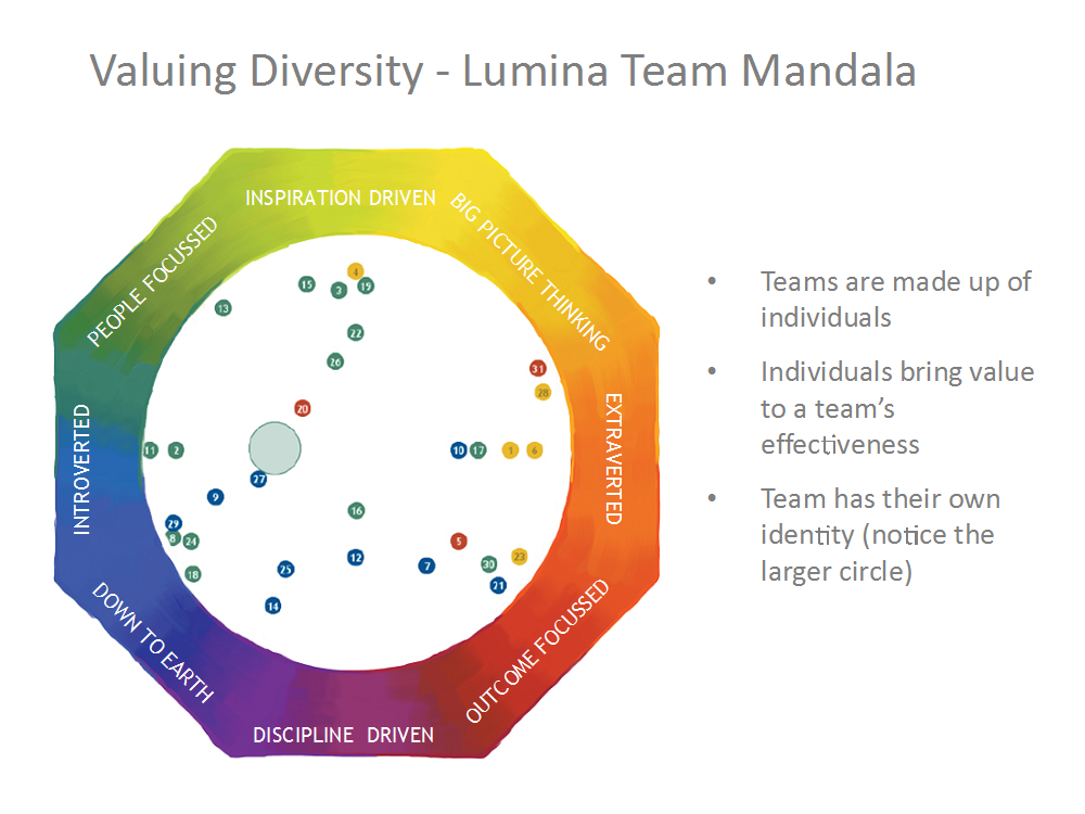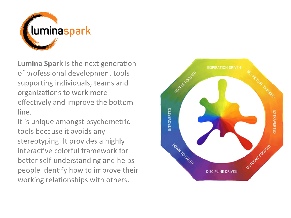 Lumina Spark Workshop is highly interactive and fun experience in which participants explore who they are using an individualized psychometric profile tool called a Lumina Spark Portrait.